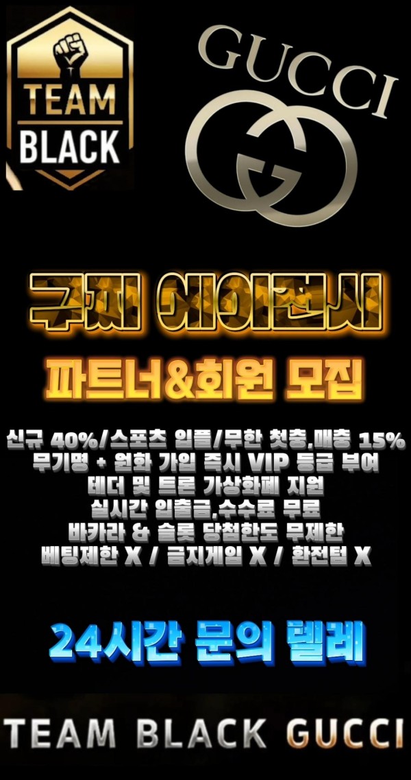 ✨️각종 혜택 챙김 케어 1위 구찌 에이전시 - 파트너 & 회원 모집 - ✨신규 40%/스포츠 입플/무한 첫충/매충 15% - 업계 최대 혜택 --- ???? 먹튀 걱정은 이제 NO! - 100% 안전 보장 - 대한민국 1등 안전 ?